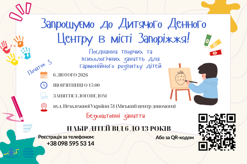 В рамках проєкту покращення ментального здоров’я дітей за підтримки World Relief та ГО “Міський Центр Допомоги” у співпраці зі Службою (управлінням) у справах дітей Запорізькї міської ради, наша організація запрошує дітей віком від 6 до 13 років на творчі та психологічні заняття для гармонійного розвитку…