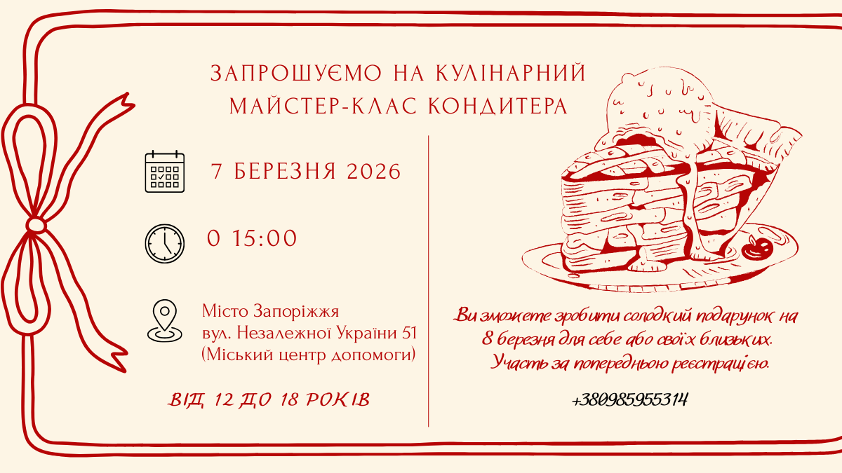 За підтримки World Relief та ГО “Міський Центр Допомоги” у співпраці зі Службою (управлінням) у справах дітей Запорізькї міської ради, наша організація запрошує підлітків віком від 12 до 18 років на майстер-клас кондитера.